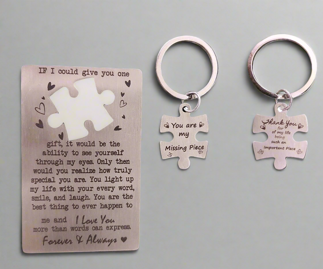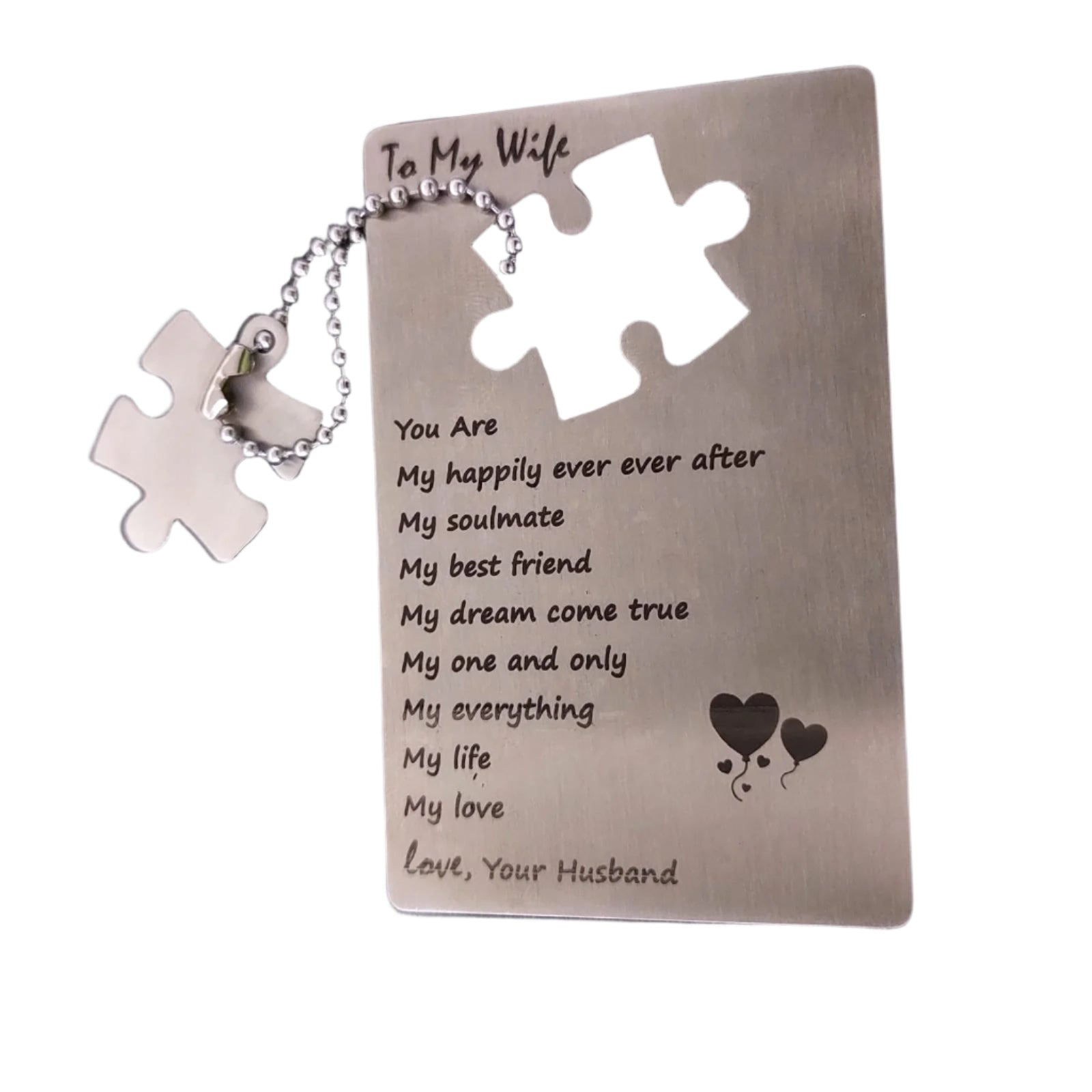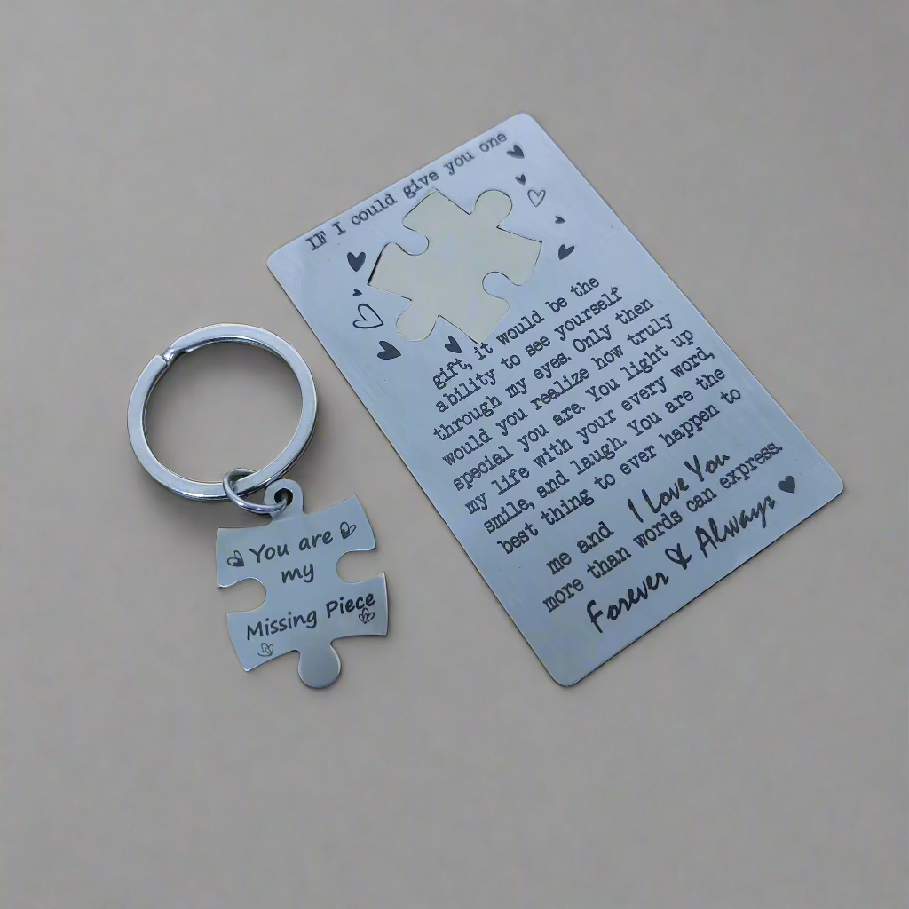 Say "I love you" in a way that lasts forever. This beautifully crafted metal card is more than just a keepsake—it’s a heartfelt message etched in steel. Designed with a unique twist, it includes a matching keyring that fits perfectly into the card like a jigsaw puzzle—symbolizing how perfectly you and your partner fit together.