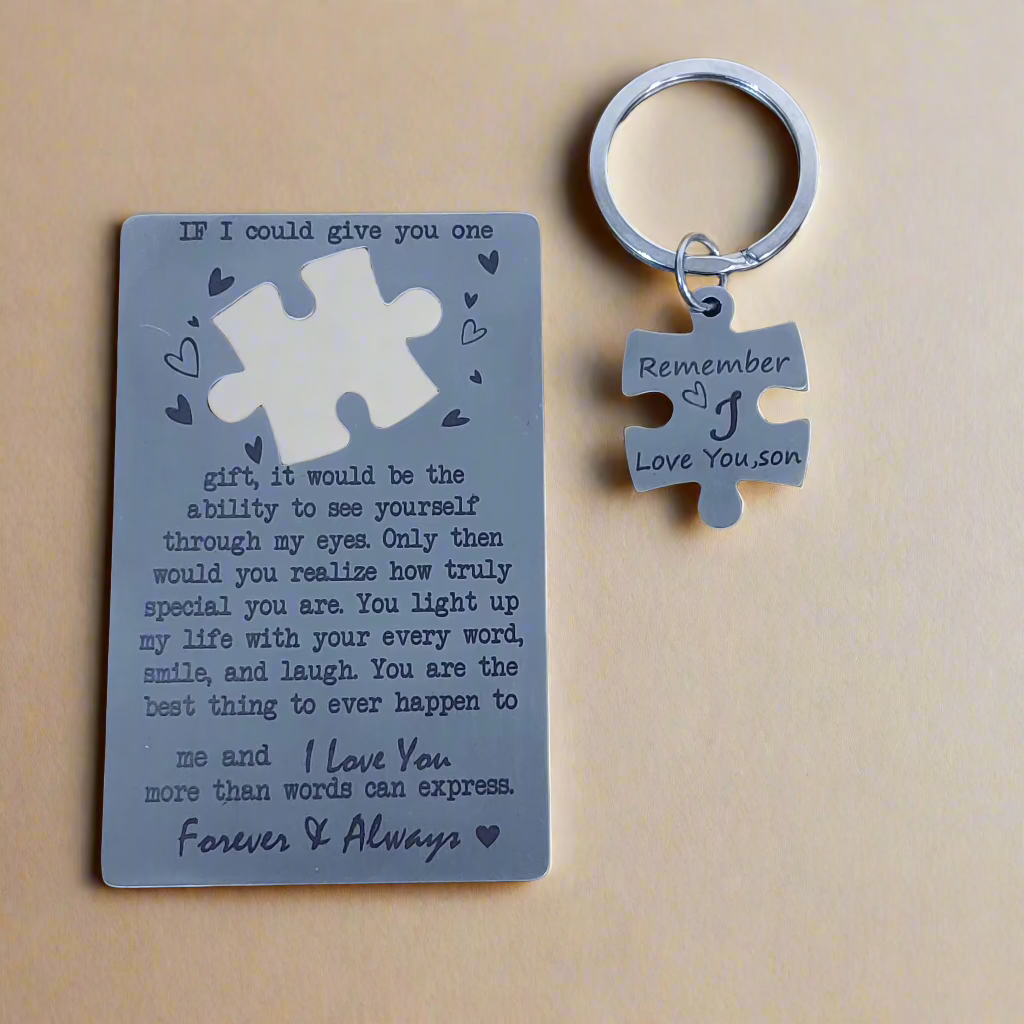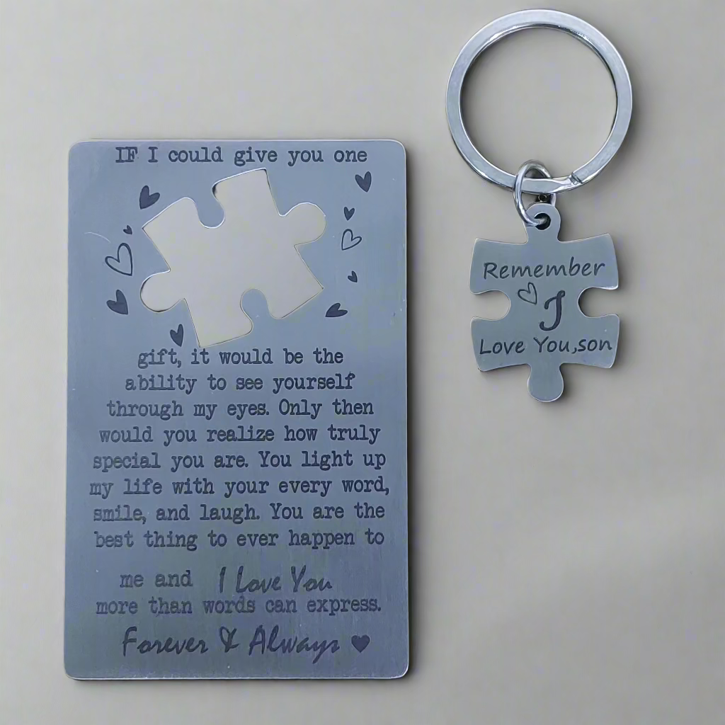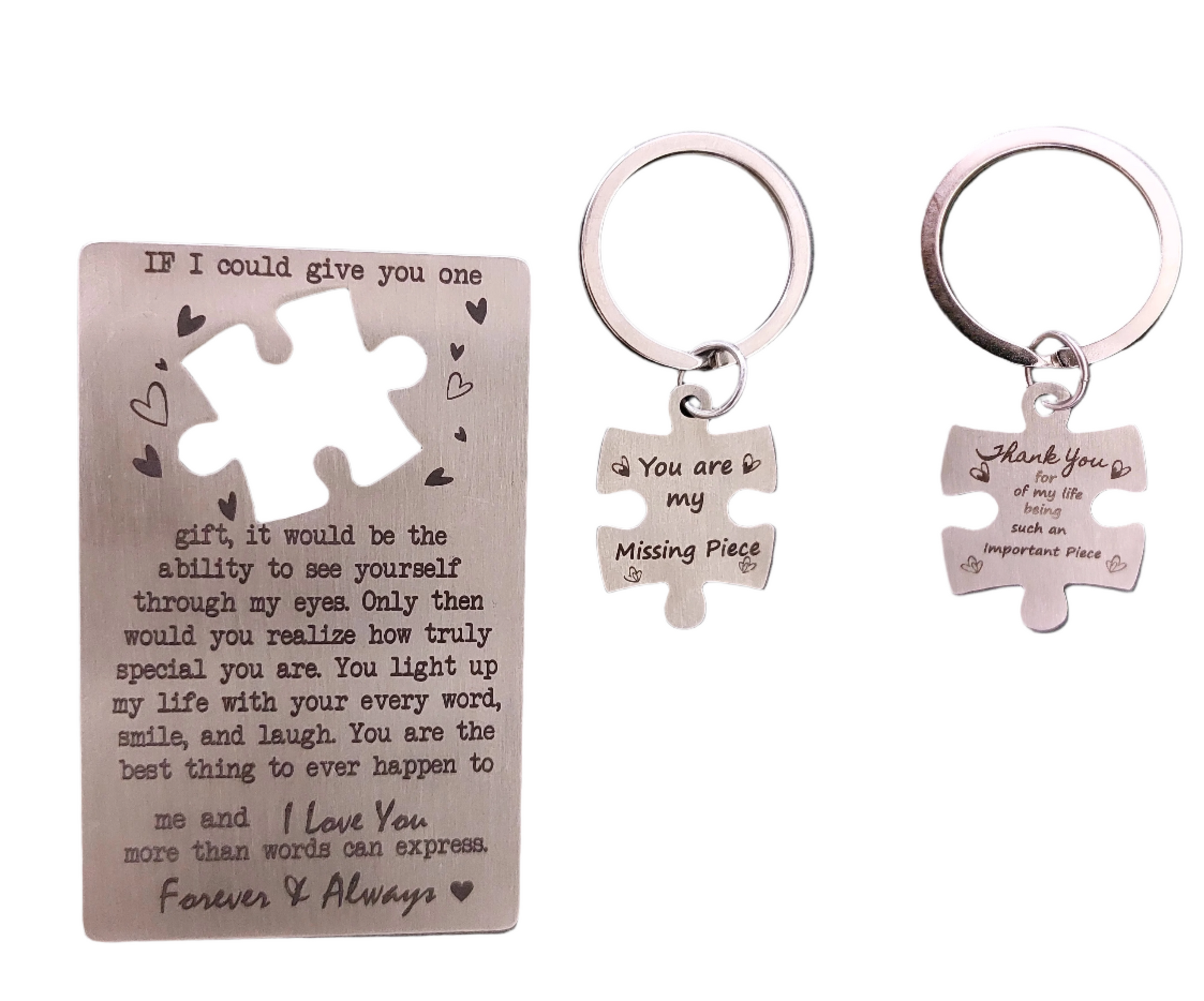 Say "I love you" in a way that lasts forever. This beautifully crafted metal card is more than just a keepsake—it’s a heartfelt message etched in steel. Designed with a unique twist, it includes a matching keyring that fits perfectly into the card like a jigsaw puzzle—symbolizing how perfectly you and your partner fit together.