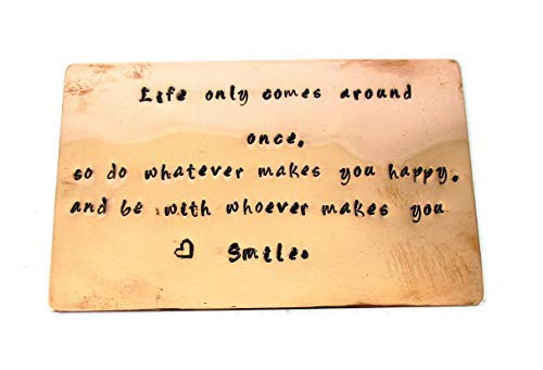 Details: Personalized copper wallet insert - anniversary wedding gift - gifts for men - 7 year anniversary gift - fathers day gift - up to 80 characters---------------------------------------------- -------------------------give your guy or girl a sweet little something to discreetly keep in his wallet and smile whenever he/she opens it. The size of a credit card, these personalized cards will fit perfectly in any wallet. Personalized with your own words, these beautifully made wallet inserts can hold up to 80 characters depending on font choice. Perfect valentines day, fathers day or anniversary gift please select the appropriate option for character limit. You can use the online character count tool to help you determine which option you need.